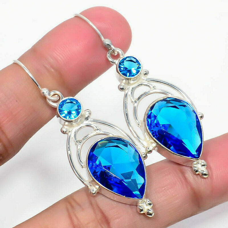 Χειροποίητα, ινδικά σκουλαρίκια κατασκευασμένα από μασίφ ασήμι 925 και διακοσμημένα με υπέροχες ορυκτές πέτρες, Blue Topaz, σε κοπή pear & round.