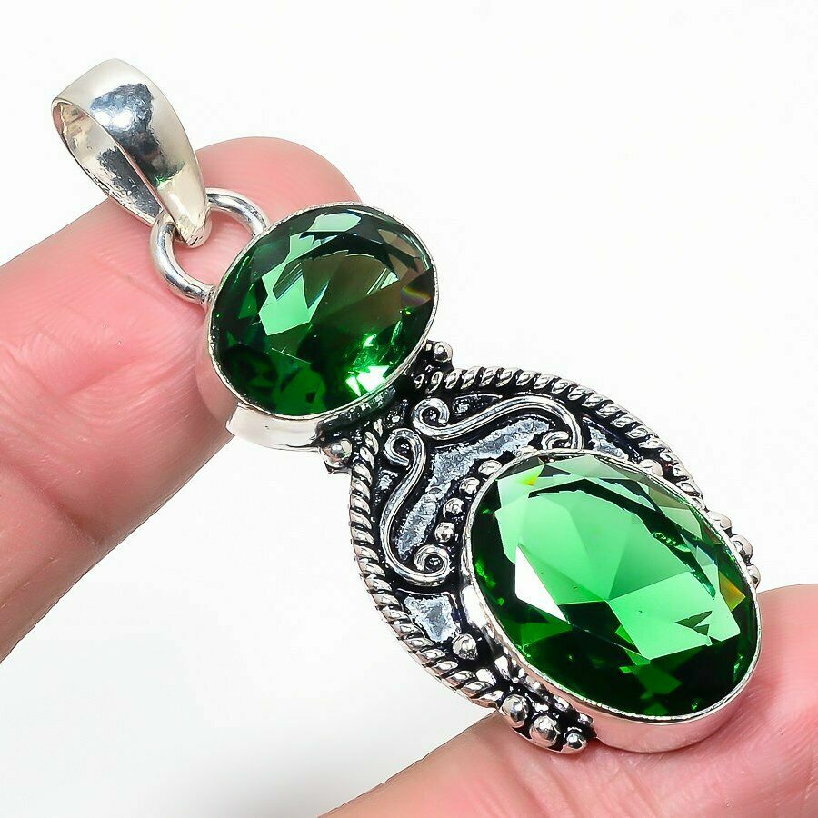 Χειροποίητο μενταγιόν, κατασκευασμένο από ασήμι 925 διακοσμημένο με ορυκτό πολύτιμο λίθο Chrome Diopside, ο οποίος συγκεκριμένος πολύτιμος λίθος είναι σε υψηλή και σταθερά αυξανόμενη ζήτηση και τιμή. Σε κοπή oval και round. Το μενταγιόν έχει μήκος 5,6 εκατοστά. Λουστρέ επίστρωση.