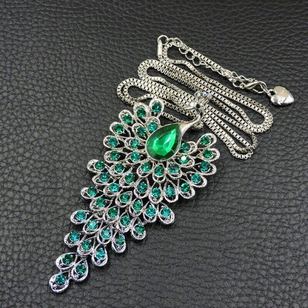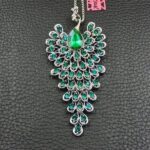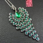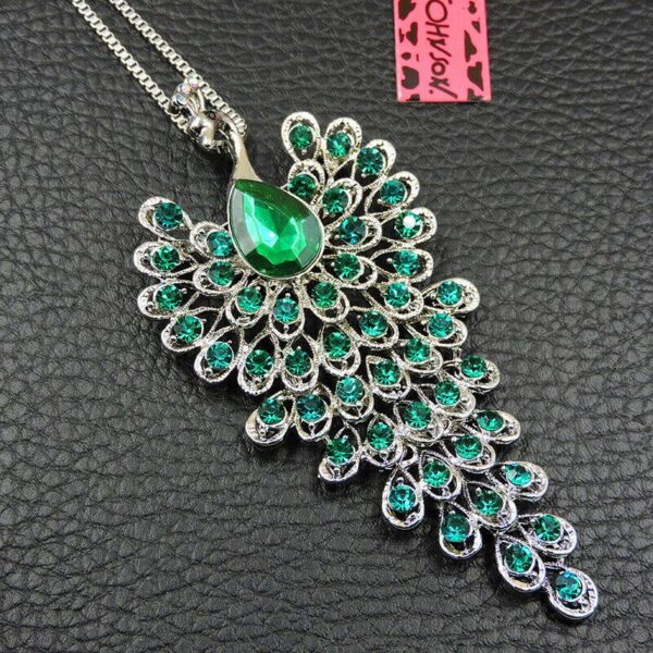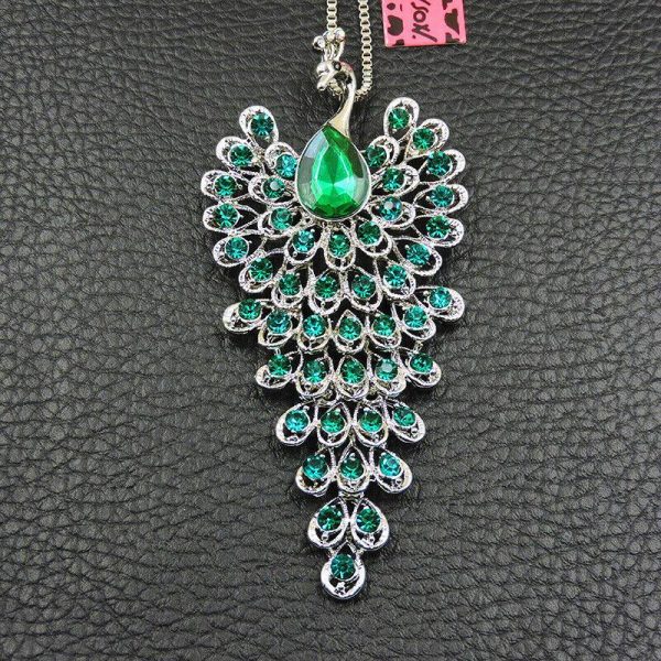 Το τυχερό παγόνι! Ένα μενταγιόν κατασκευασμένο από ασήμι και χαλκό. Μεγάλο μοτίφ 10×5 εκατοστά. Συνοδεύεται από αλυσίδα 70 εκατοστών. Σχεδιασμένο από την Betsey Johnson. Διακοσμημένο με πράσινα κρύσταλλα εξαιρετικής καθαρότητας και λάμψης σε κοπή round. Με το πράσινο κρύσταλλο στο κέντρο του να πρωταγωνιστεί σε κοπή pear.