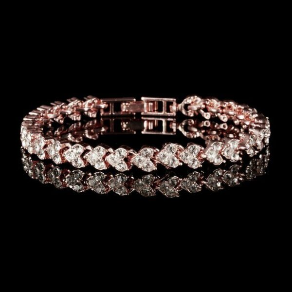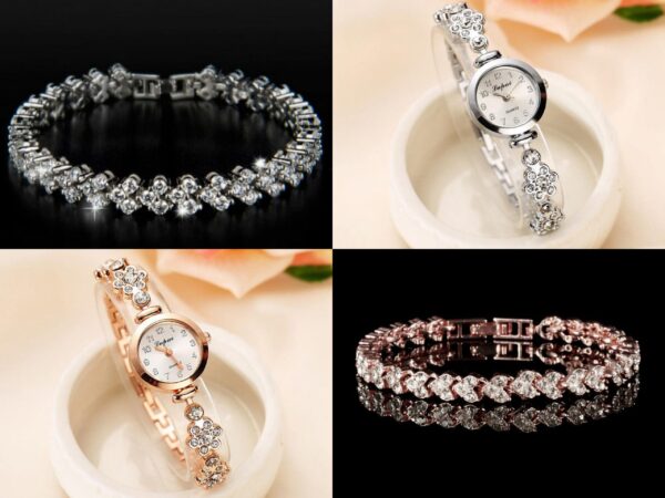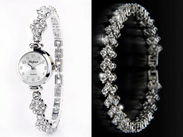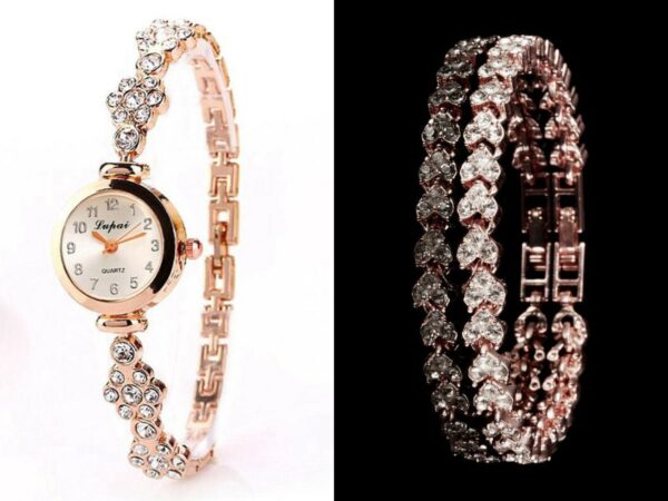 Γυναικείο σετ που αποτελείται από αναλογικό ρολόι, κατασκευασμένο από ατσάλι και διακοσμημένο με λευκά αυστραλιανά κρύσταλλα σε σχήμα μαργαρίτας σε κοπή round και διαθέτει διπλή επιμετάλλωση ροζ χρυσού 14Κ και από βραχιόλι διακοσμημένο με δυο σειρές λαμπερά αυστραλιανά κρύσταλλα, κατασκευασμένο από ατσάλι και επιμετάλλωση από λευκόχρυσο μήκους 17,5 εκατοστών!