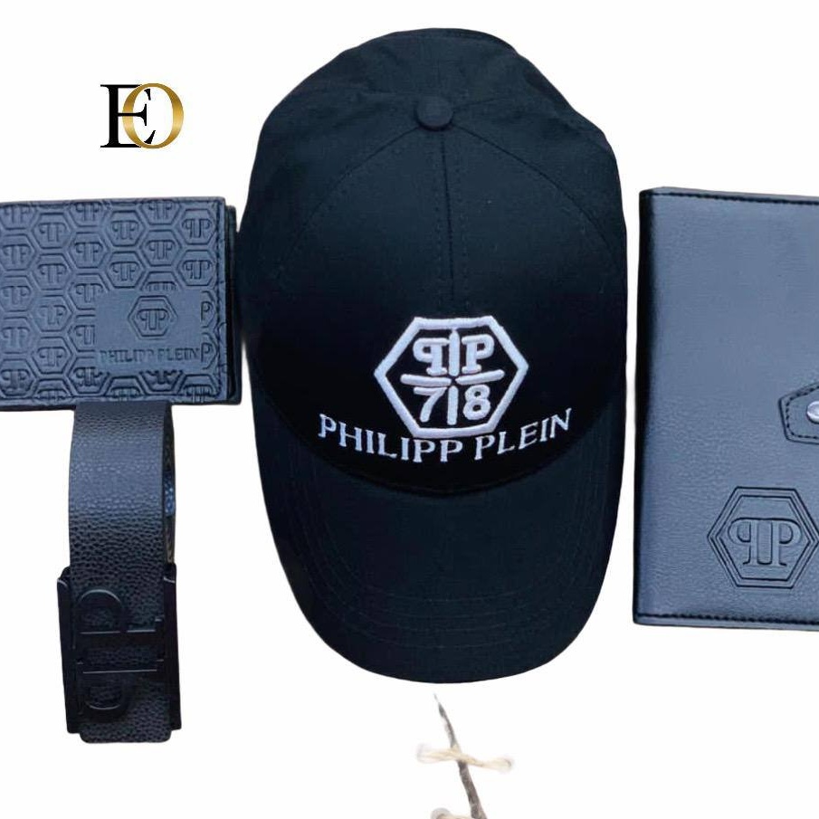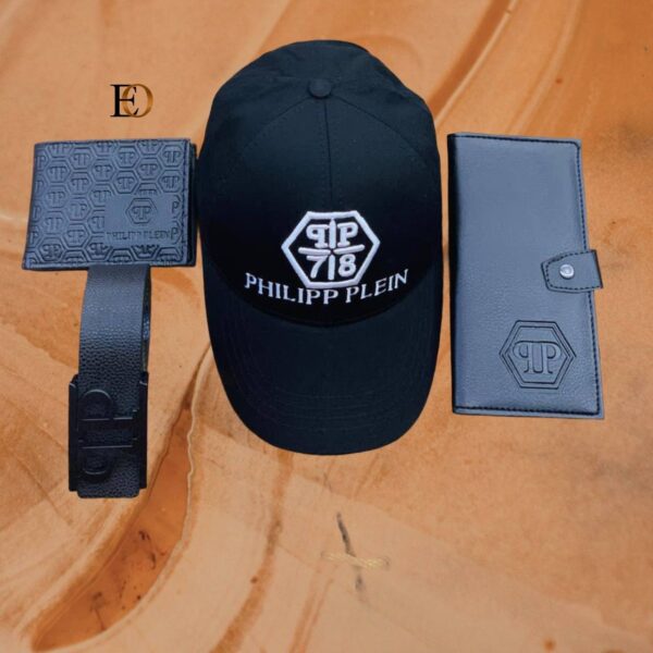 Ανδρικό ολοκληρωμένο σετ PHILIPP PLEIN για δυναμικές εμφανίσεις. Το σετ περιλαμβάνει ένα (1) μεγάλο πορτοφόλι-organizer για κάρτες, ένα (1) πορτοφόλι τσέπης, μία (1) ζώνη και ένα (1) καπέλο PHILIPP PLEIN.