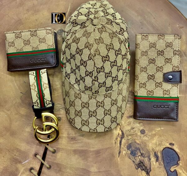 Ανδρικό ολοκληρωμένο σετ GUCCI για νεανικές και δυναμικές εμφανίσεις. Το σετ περιλαμβάνει ένα (1) μεγάλο πορτοφόλι-organizer για κάρτες, ένα (1) πορτοφόλι τσέπης, μία (1) ζώνη και ένα (1) καπέλο GUCCI.