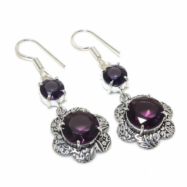 Χειροποίητα, σκουλαρίκια κατασκευασμένα από ασήμι 925, διακοσμούνται με ημιπολύτιμους λίθους. Πρωταγωνιστικός ορυκτός λίθος ο Amethyst (αμέθυστος) εξαιρετικής καθαρότητας και λάμψης, σε κοπή round. Tα σκουλαρίκια έχουν μήκος 5 εκατοστά.
