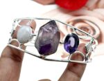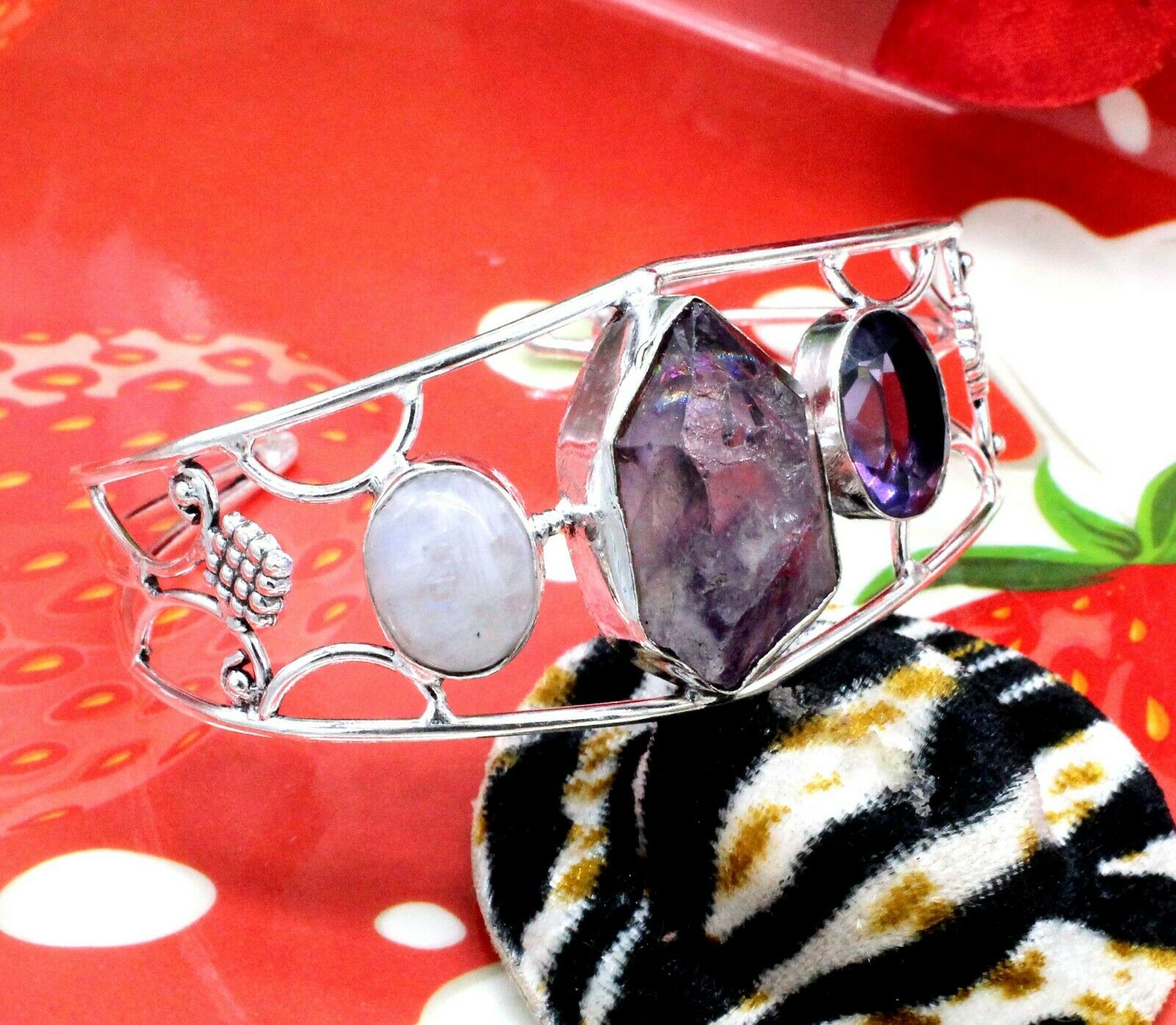 Χειροποίητο, ινδικό βραχιόλι κατασκευασμένο από ασήμι 925, διακοσμημένο με ορυκτό, φυσικό, ακατέργαστο αμέθυστο και φεγγαρόπετρα (Amethyst & Moonstone).  Ένα πραγματικό αριστούργημα. Open Size έτσι ώστε να προσαρμόζεται σε όλους τους καρπούς.