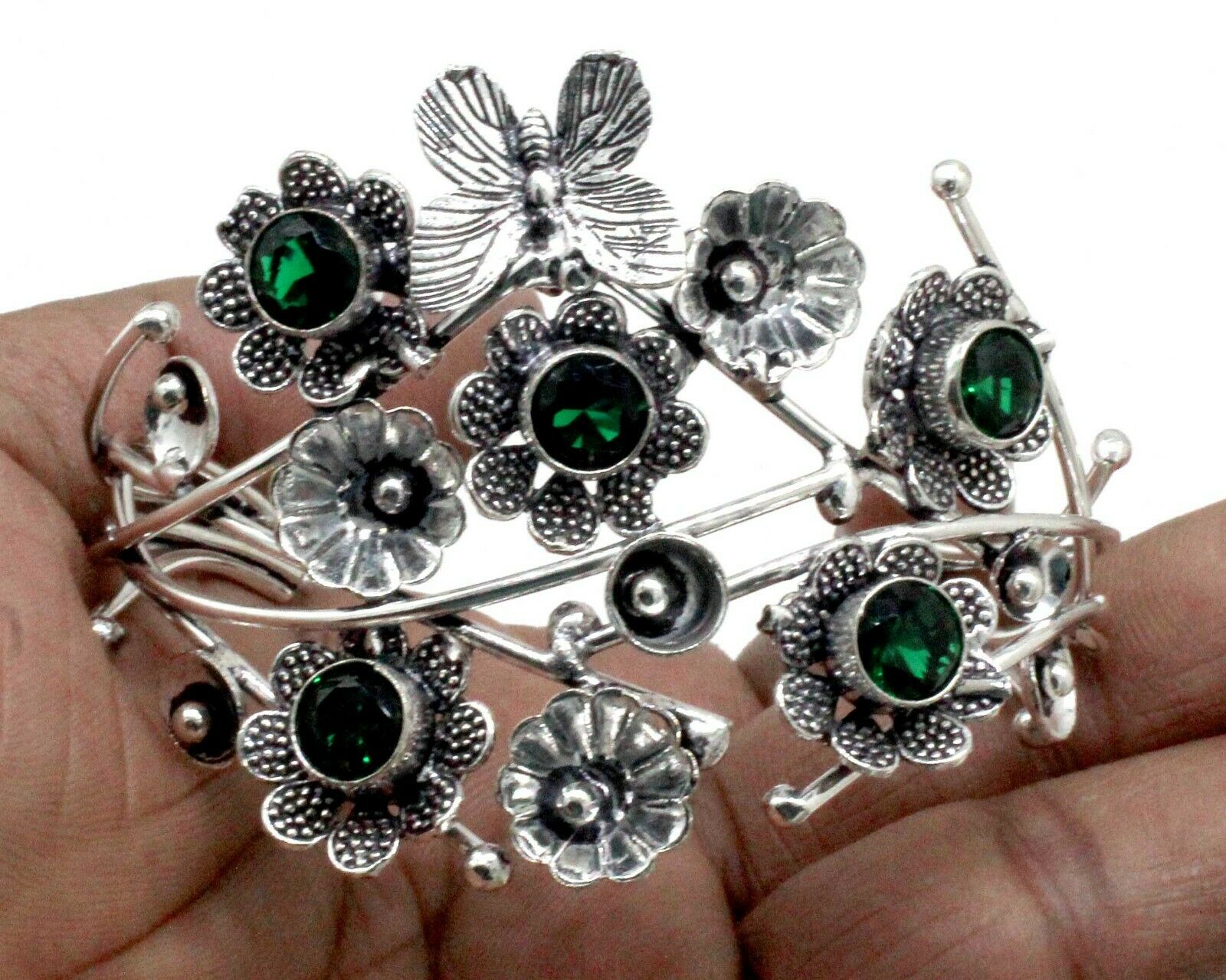 Χειροποίητο, ινδικό βραχιόλι κατασκευασμένο από ασήμι 925, διακοσμημένο με υπέροχους πράσινους λίθους Chrome Diopside (lab creation) σε κοπή round . Total Carat Weight (TCW): 120 CTS. Οpen Size για να προσαρμόζεται σε όλους τους καρπούς. Ένα πραγματικό αριστούργημα.