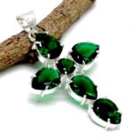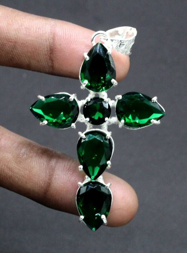 Iνδικός, χειροποίητος γυναικείος σταυρός, κατασκευασμένος από μασίφ ασήμι 925. Διακοσμημένος με καταπράσινες υπέροχες, λαμπερές πέτρες Chrome Diopside (Lab creation) διαστάσεων 5,5 χ 3,5 εκατοστά. Τιμή 55 ευρώ