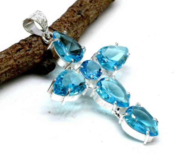Iνδικός, χειροποίητος γυναικείος σταυρός, κατασκευασμένος από μασίφ ασήμι 925. Διακοσμημένος με υπέροχες, λαμπερές πέτρες μπλε τοπάζι (Blue Topaz) (Lab creation) διαστάσεων 5,5 χ 3,5 εκατοστά. Τιμή 55 ευρώ