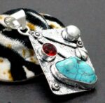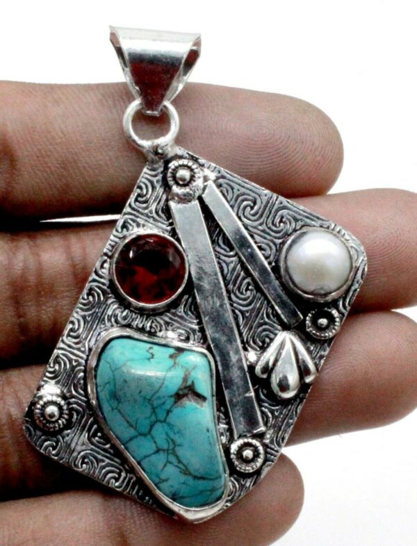 Καταπληκτικό μενταγιόν κατασκευασμένο από ασήμι 925. Διακοσμείται από φυσικές, 100% ορυκτές, πολύτιμες πέτρες, τυρκουάζ, γρανάτη μοζαμβίκης και mother of Pearl. Το μενταγιόν έχει διαστάσεις 4,2X 3,2 εκατοστά.