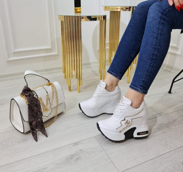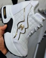 Υπέροχα γυναικεία αθλητικά μποτάκια Chanel σε άσπρο χρώμα με χρυσές λεπτομέρειες, ελαφριά και εξαιρετικά αναπαυτικά. Διαθέτουν εσωτερικό κρυφό τακούνι 7,5 εκατοστών, ιδανικά για να αναδεικνύουν μία ελκυστική σιλουέτα. Υπόσχονται άνετο περπάτημα και είναι για όλες τις ώρες της ημέρας.