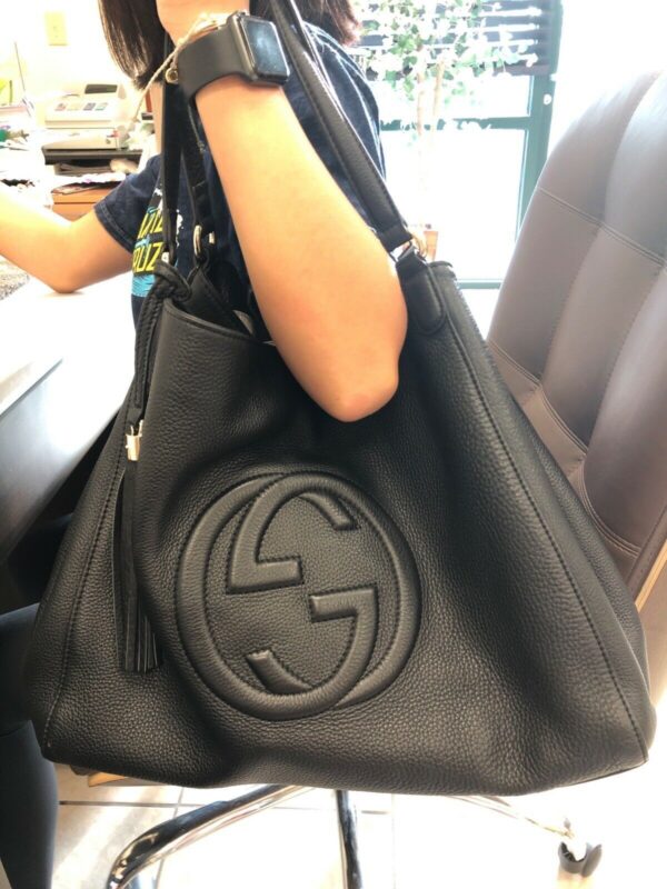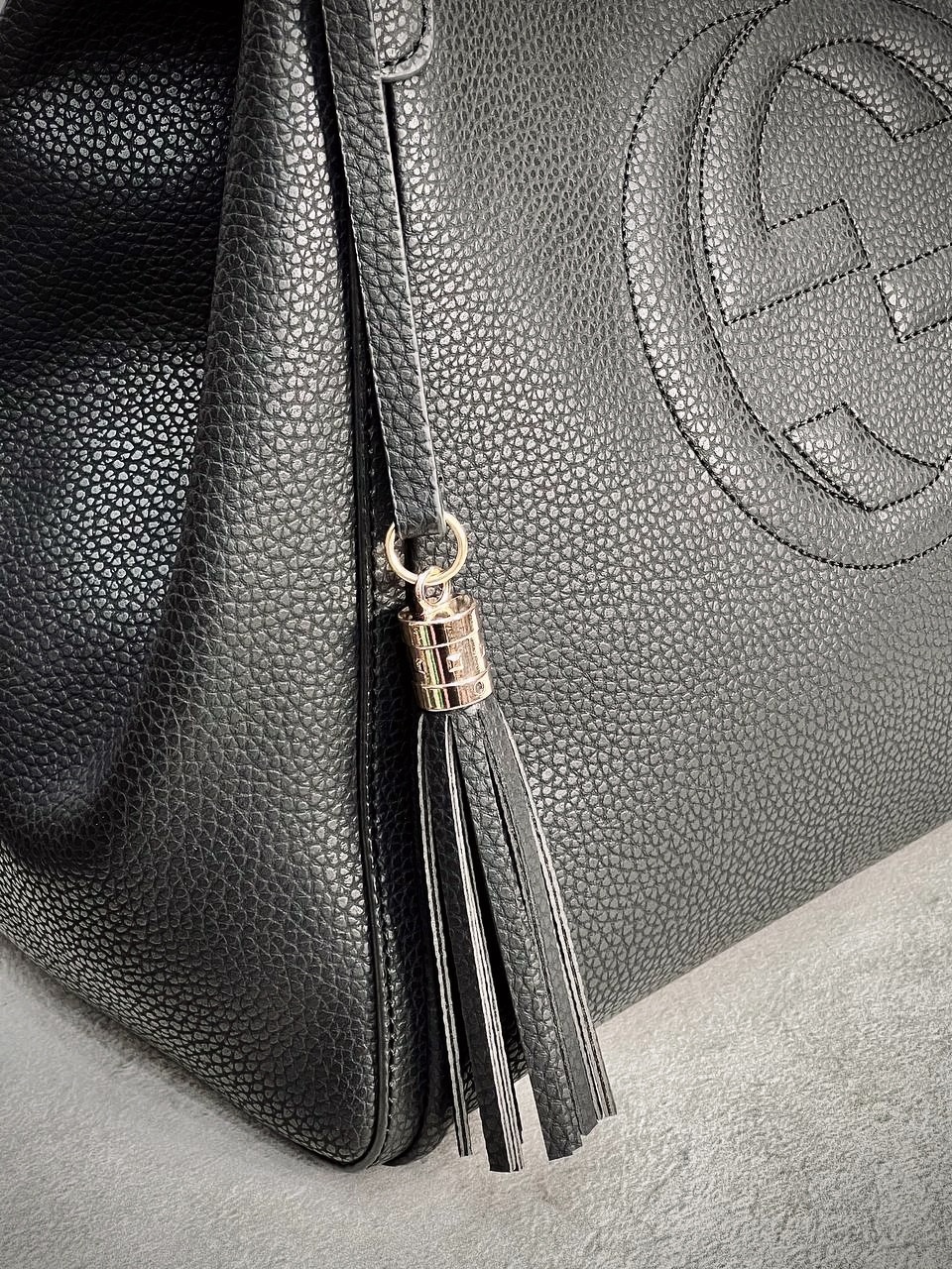 Η τσάντα ώμου «Soho Hobo» έχει ανάγλυφο το λογότυπο «G» της ετικέτας και τελειώνει με παιχνιδιάρικη φούντα. Κατασκευασμένη στην Ιταλία από ελαστικό δέρμα και επένδυση σε καμβά, αυτή η μεγάλη τσάντα σας εξυπηρετήσει ώστε να μεταφέρετε εύκολα τη θήκη για το tablet, το πορτοφόλι και τα καλλυντικά σας. Εσωτερικές τσέπες με φερμουάρ και smart phone