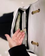 Διακοσμείται με την εμβληματική μεταλλική χρυσή αγκράφα.