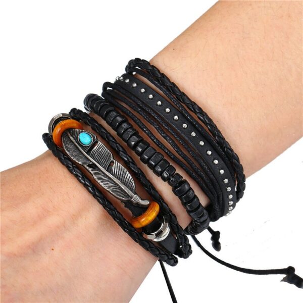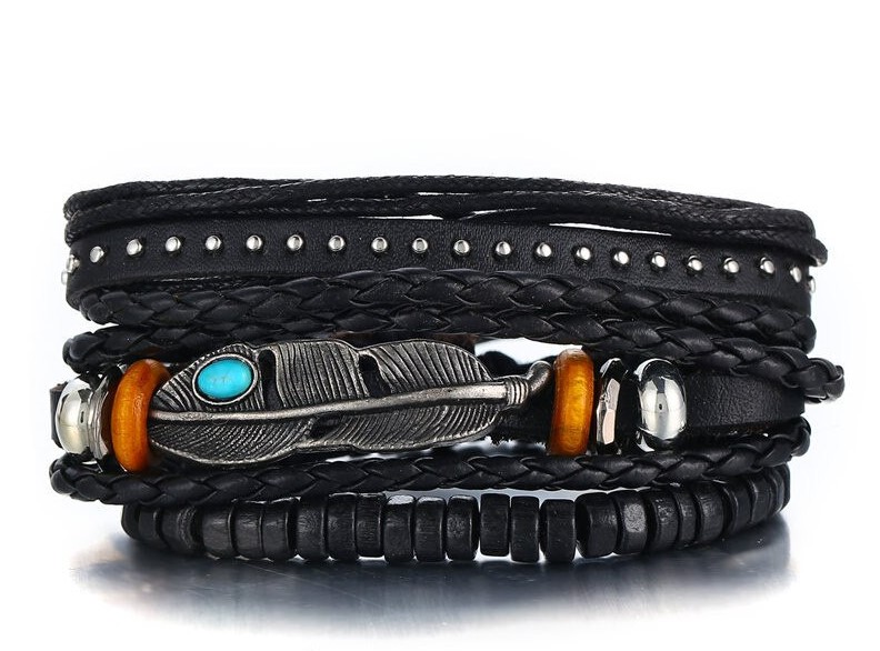 Vintage ανδρικό βραχιόλι, κατασκευασμένο από δέρμα αγελάδας, ξύλο και ατσάλι, με τυρκουάζ χάντρα για να μη σας πιάνει το μάτι. Αποτελείται από 3 ξεχωριστά βραχιόλια και προσαρμόζεται σε όλους τους καρπούς!