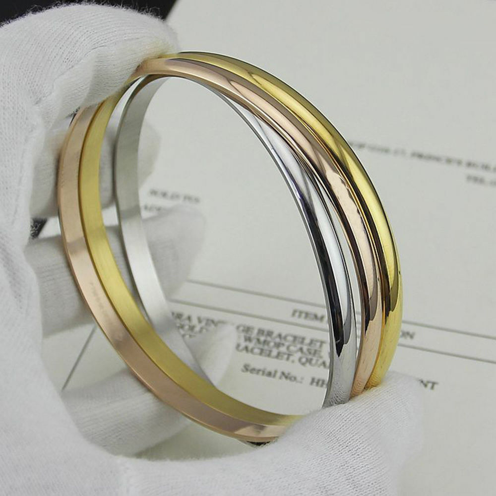 Τριπλό γυναικείο βραχιόλι (στα χρώματα του Cartier), ενωμένα μεταξύ τους και περασμένα το ένα μέσα στο άλλο! Είναι κατασκευασμένα από ανοξείδωτο ατσάλι με διπλή επιμετάλλωση από λευκό, κίτρινο και ροζ χρυσό! ΤΙΜΗ 26 ευρώ κωδικός TO232