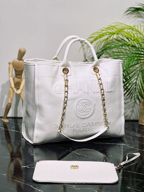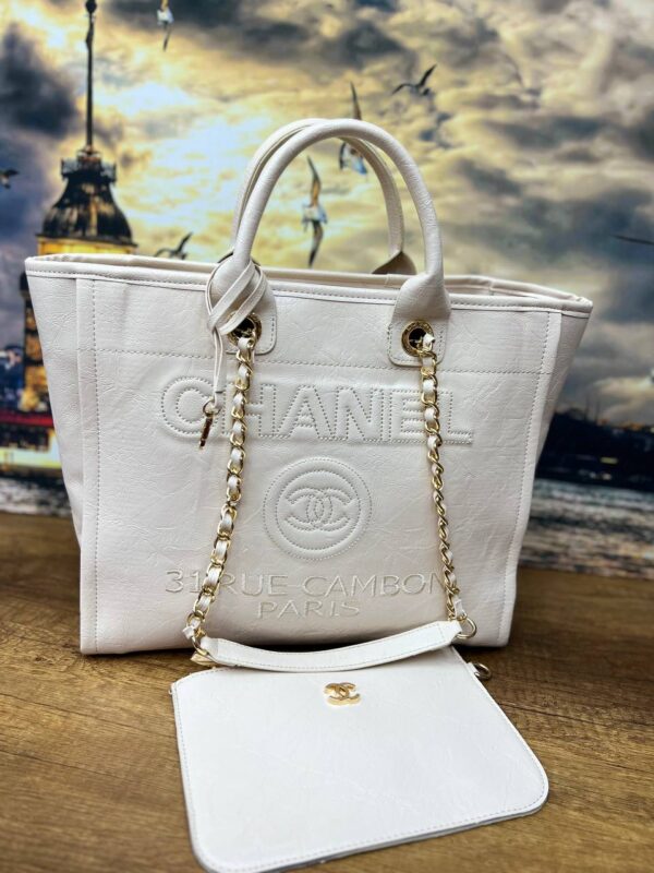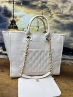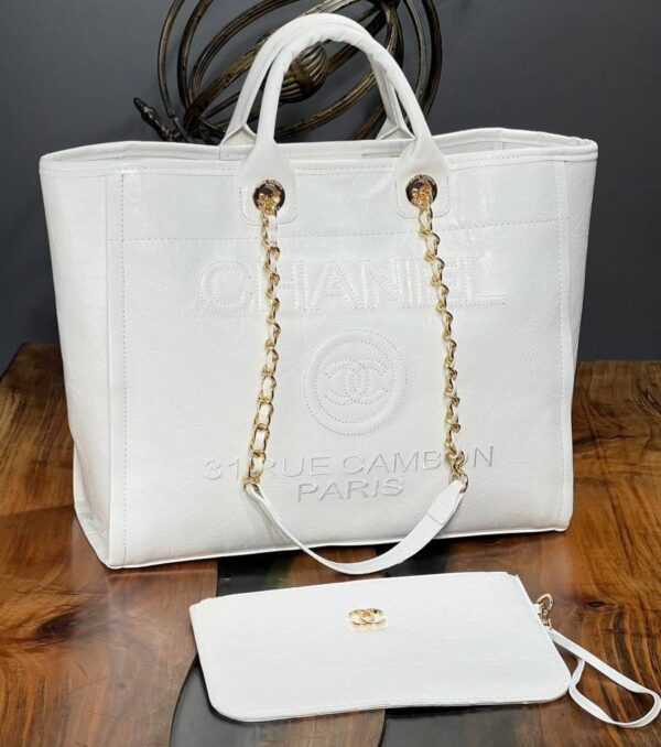 Αυτή η υπέροχη τσάντα tote είναι φτιαγμένη από άσπρο γυαλιστερό δέρμα. Η τσάντα διαθέτει ιστορικό διαφημιστικό λογότυπο στο εμπρός μέρος της και υπέροχες χρυσές λεπτομέρειες. Το επάνω μέρος είναι ανοιχτό με υφασμάτινο εσωτερικό με φερμουάρ και τσέπες patch. Διαθέτει επίσης άσπρη καπιτονέ τσέπη στο πίσω μέρος της τσάντας έτσι ώστε να μπορείτε να τοποθετήσετε το κινητό σας τηλέφωνο. Η τσάντα εσωτερικά διαθέτει extra αποσπώμενο τσαντάκι- νεσεσέρ. Απολαύστε αυτή την tote για τις καθημερινές σας ανάγκες με το διαχρονικό στυλ της!