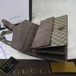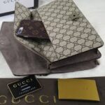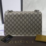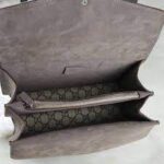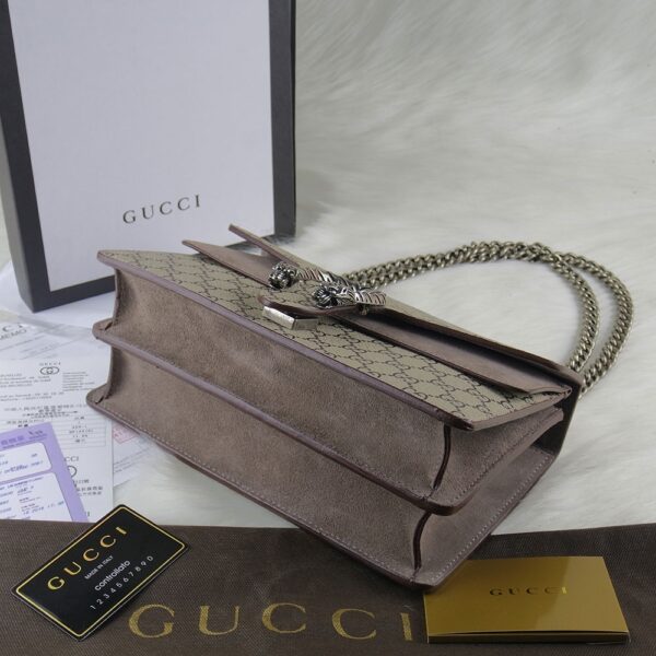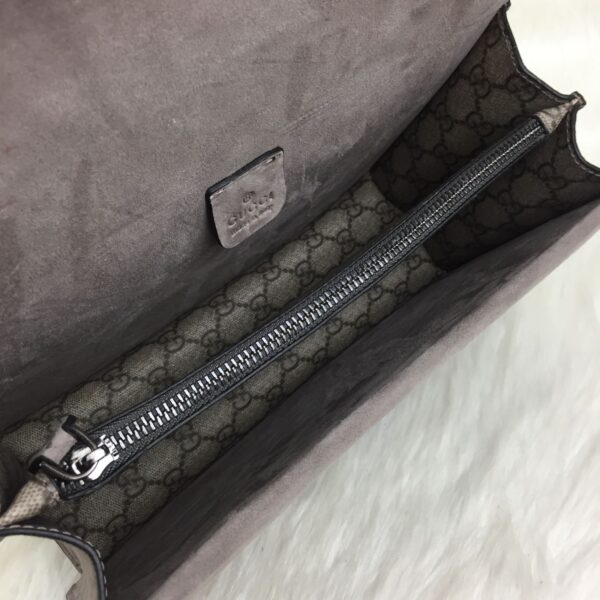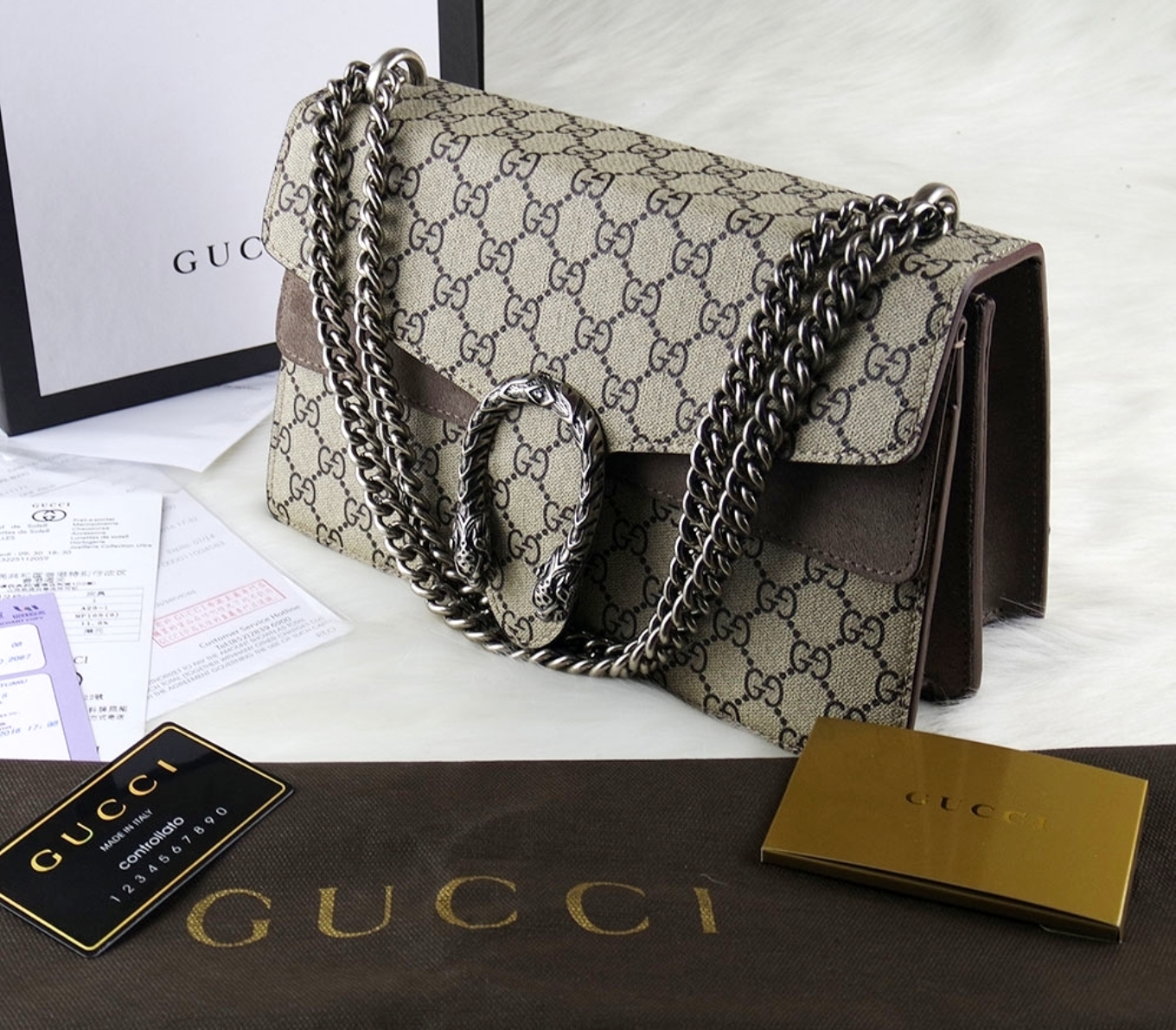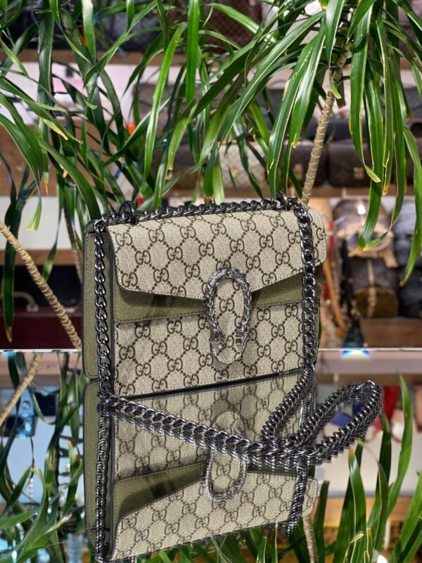 Gucci Supreme τσάντα με καμβά GG με υπέροχες λεπτομέρειες από green-gray σουέτ δέρμα. Mε το ανάγλυφο κλείσιμο του κεφαλιού τίγρης – μια μοναδική λεπτομέρεια που αναφέρεται στον Έλληνα θεό Διόνυσο, ο οποίος σύμφωνα με τον μύθο λέγεται ότι διέσχισε τον ποταμό Τίγρη πάνω σε μια τίγρη που του έστειλε ο Δίας..