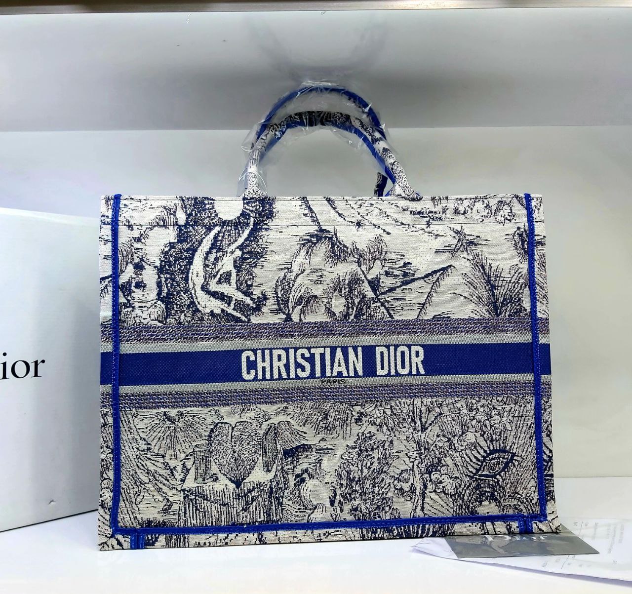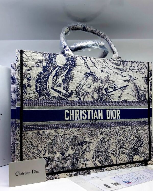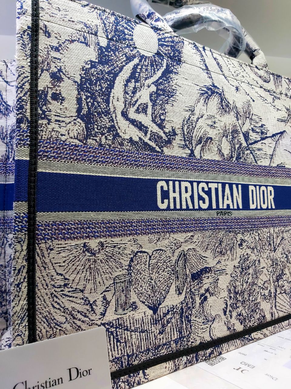 Η Dior Book Tote έχει γίνει βασικό στοιχείο της αισθητικής. Σχεδιασμένο για να διατηρεί όλα τα καθημερινά είδη πρώτης ανάγκης, με κεντημένο μαύρο μοτίβο με την υπογραφή «Christian Dior» στο μπροστινό μέρος. Η τσάντα αποτελεί παράδειγμα της καθημερινότητας και μπορεί να μεταφερθεί στο χέρι ή να φορεθεί στον ώμο. Είναι κατασκευασμένη από υψηλής ποιότητας καμβά ζωγραφικής.