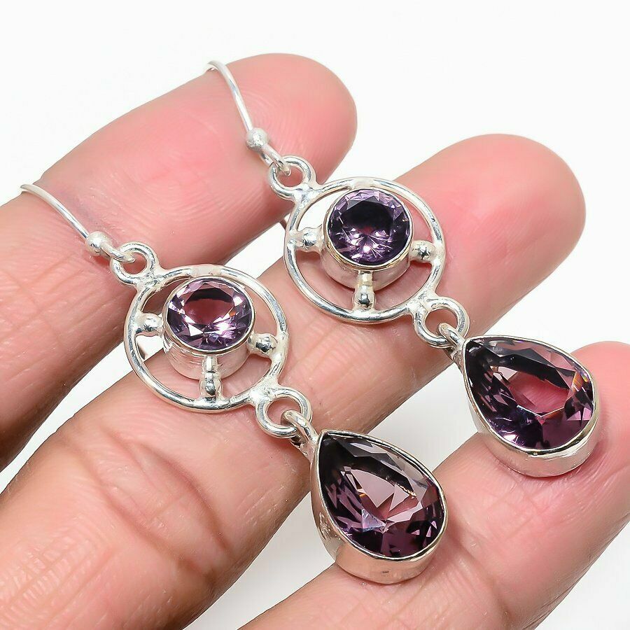 Χειροποίητα ινδικά σκουλαρίκια κατασκευασμένα από ασήμι 925, διακοσμημένα με δύο υπέροχες, πέτρες αφρικάνικου αμέθυστου (Lab-Created) σε κοπή pear και round!