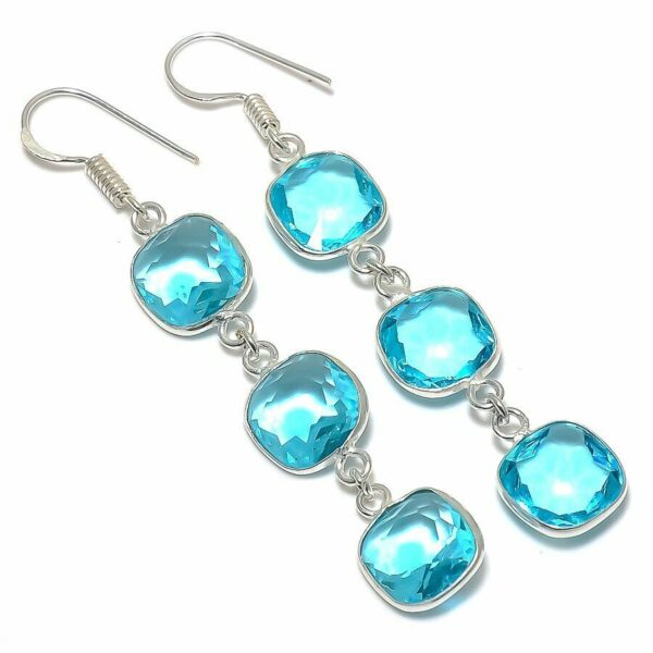 Εξαιρετικά, χειροποίητα σκουλαρίκια, κατασκευασμένα από ασήμι 925 και διακοσμημένα με 100% ορυκτές πέτρες Swiss Blue Topaz σε κοπή ashoka. Total Carat Weight (TCW): 30. Τα σκουλαρίκια έχουν μήκος 8 εκατοστά.