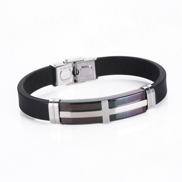 Μοντέρνο μαύρο ανδρικό βραχιόλι, με μοτίφ το αιώνιο σύμβολο του σταυρού. Kατασκευασμένο από σιλικόνη και ανοξείδωτο ατσάλι έτσι ώστε να μένει αμετάβλητο στο χρόνο. Το βραχιόλι έχει μήκος 21 εκατοστά.