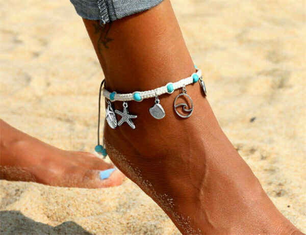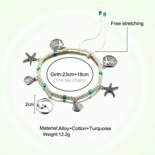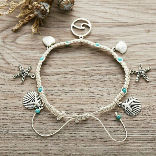 Ιδιαίτερη και άκρως καλοκαιρινή πλεκτή αλυσίδα ποδιού! Διακοσμημένη με πέτρες τυρκουάζ και μοτίφ από κοχύλια και αστερίες κατασκευασμένα από ατσάλι.