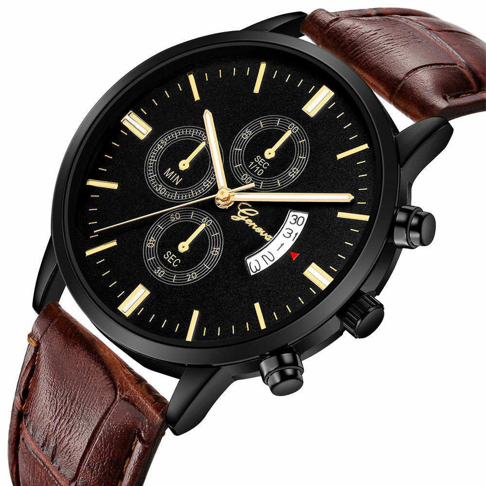 Ανδρικό, αναλογικό ρολόι GENEVA, με δερμάτινο λουράκι και μαύρο καντράν με λευκές και χρυσές αποχρώσεις. Η κάσα του είναι από ανοξείδωτο ατσάλι. Διαθέτει ένδειξη ημερομηνίας. Το λουρί έχει μήκος 25 εκατοστά και η διάμετρος του καντράν είναι 4,5 εκατοστά.