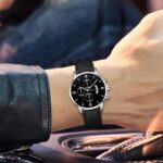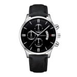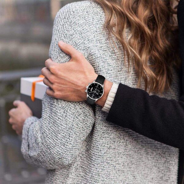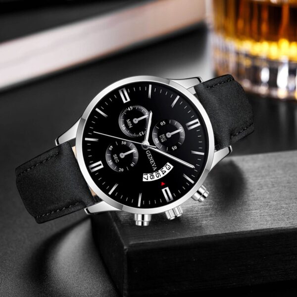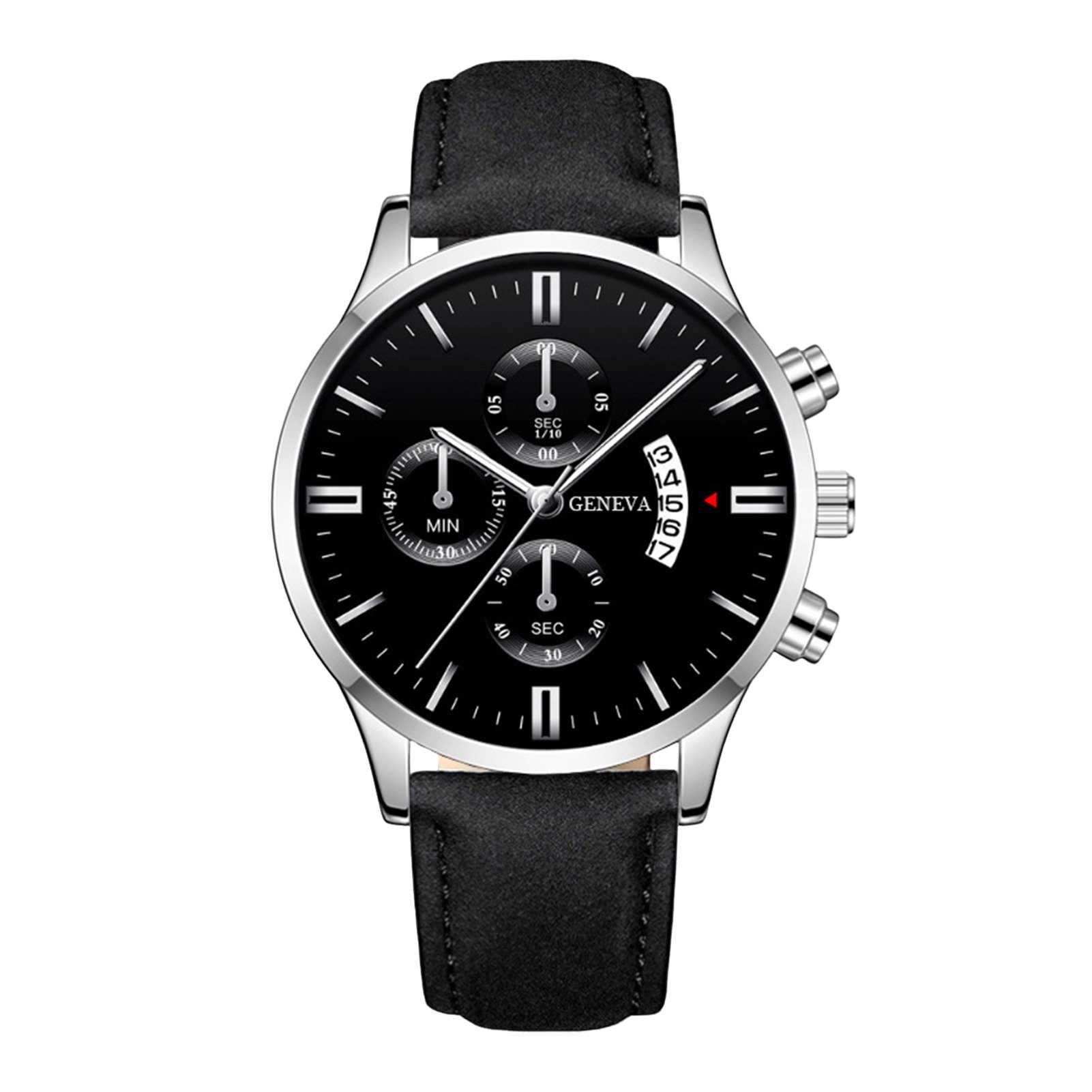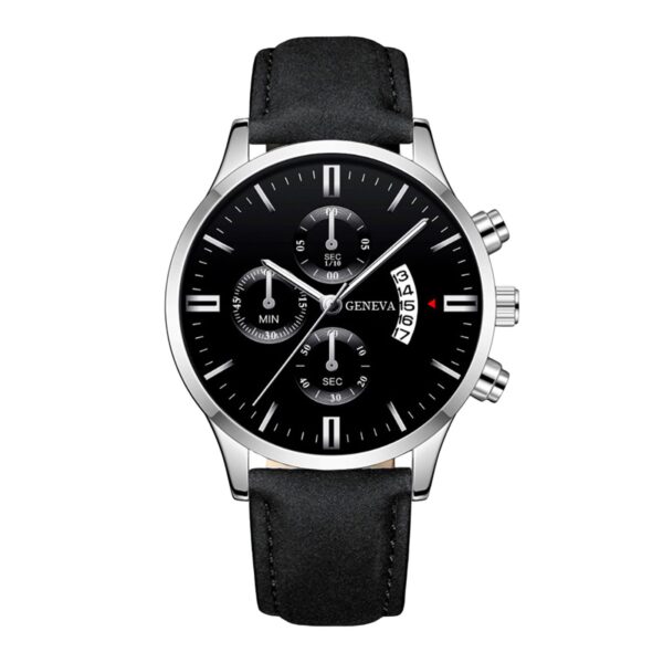 Ανδρικό, αναλογικό ρολόι GENEVA, με δερμάτινο λουράκι και μαύρο καντράν με silver αποχρώσεις. Η κάσα του είναι silver χρώματος από ανοξείδωτο ατσάλι. Διαθέτει ένδειξη ημερομηνίας. Το λουρί έχει μήκος 25 εκατοστά και η διάμετρος του καντράν είναι 4,5 εκατοστά.
