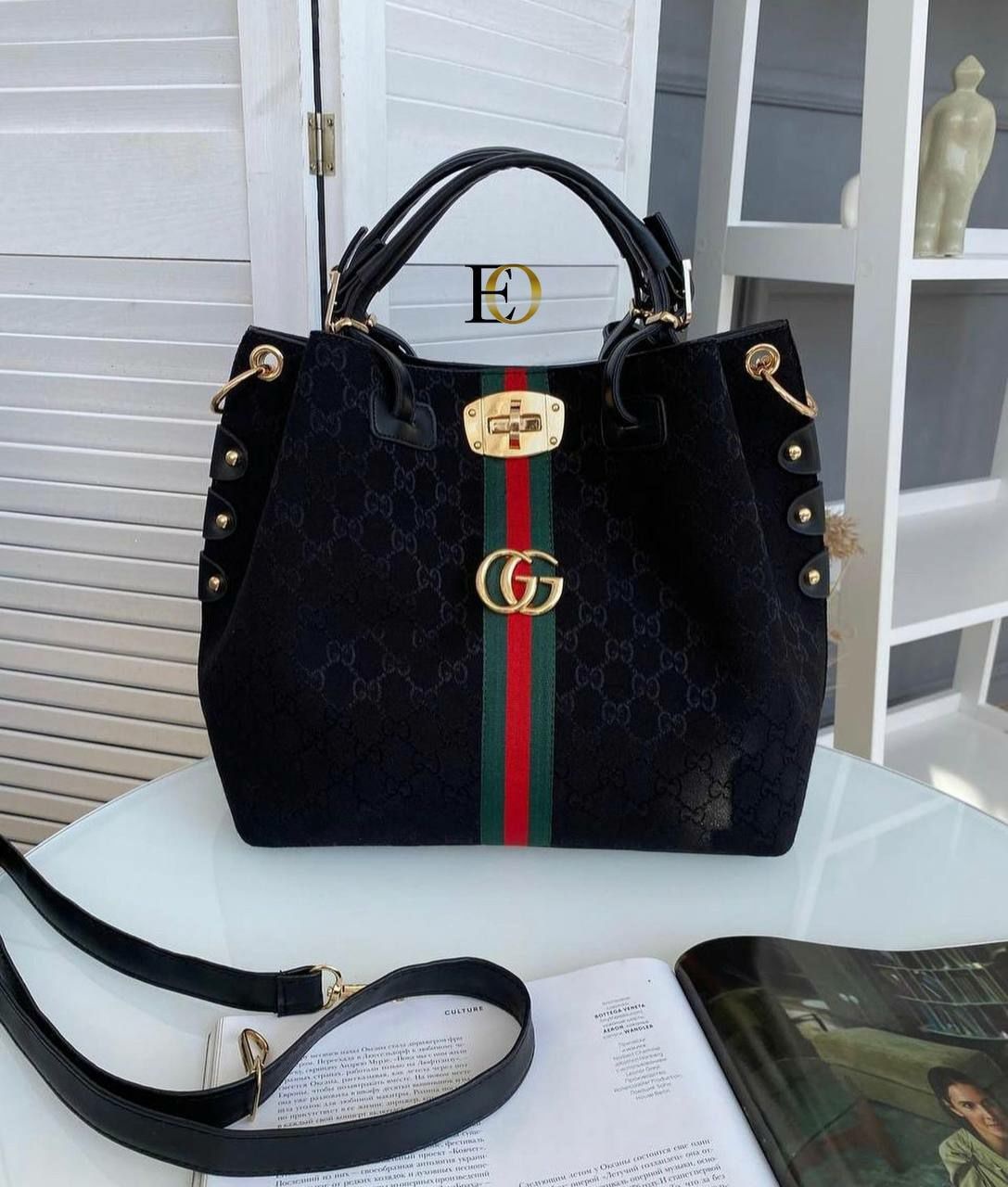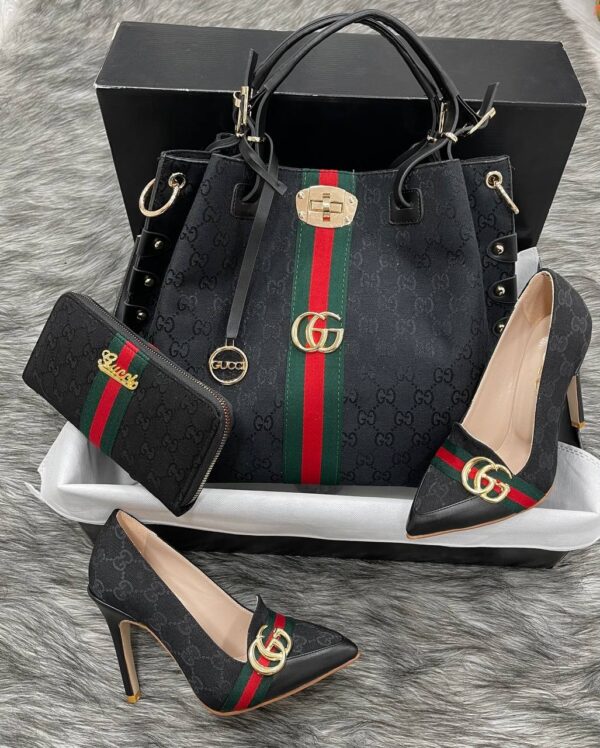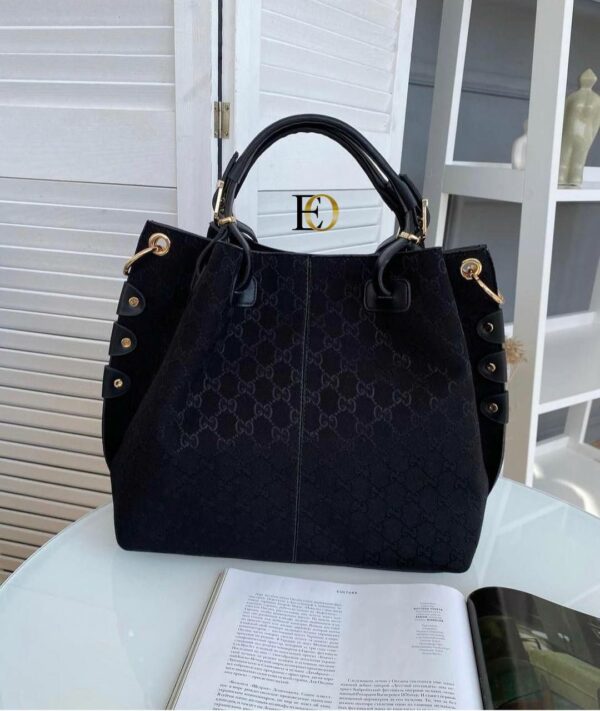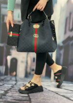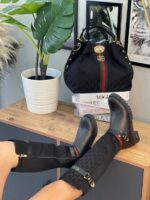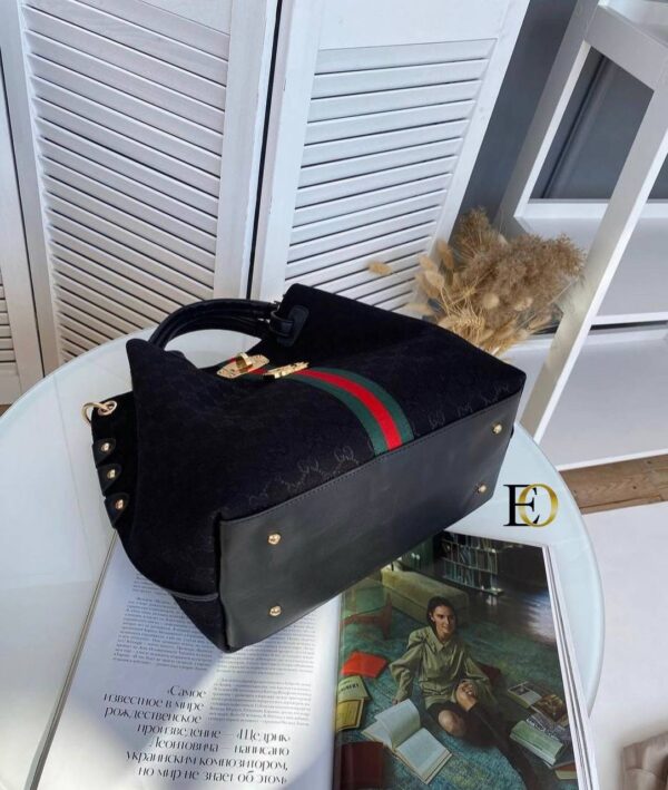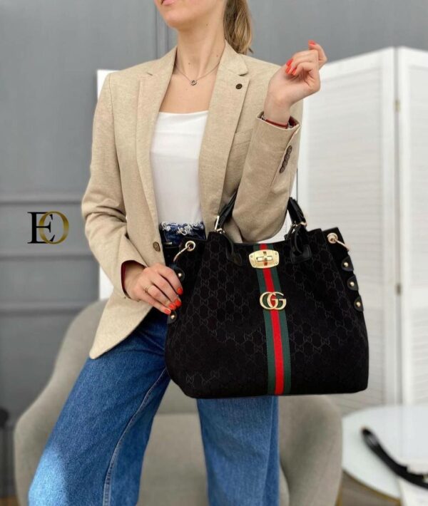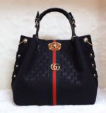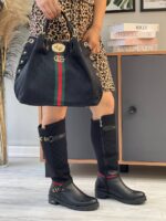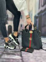 Τσάντα γυναικεία Gucci σε μαύρο χρώμα με κόκκινες-πράσινες λεπτομέρειες και μεταλλικό χρυσό λογότυπο Gucci. Μπορείτε να τη φορέσετε και στον ώμο, διαθέτει ιμάντα. Συνοδεύεται με ιμάντα ώμου.BAG GUCCI, POLYESTER 65%, COTTON 18%, LEATHER 17%, Measurements 42x37x8cm.
