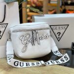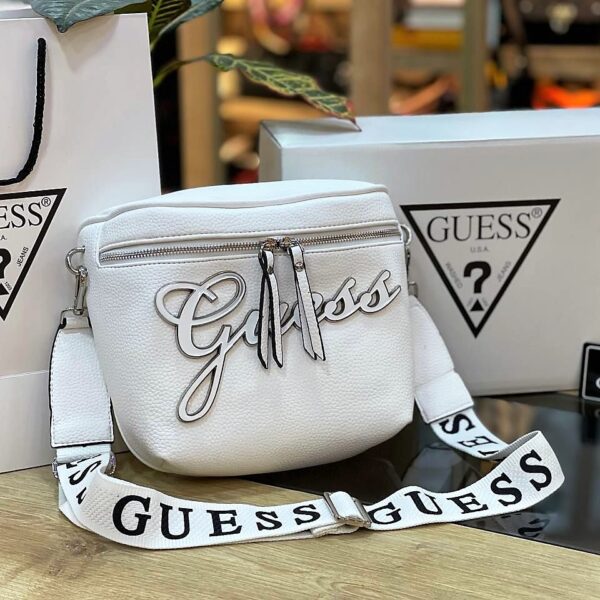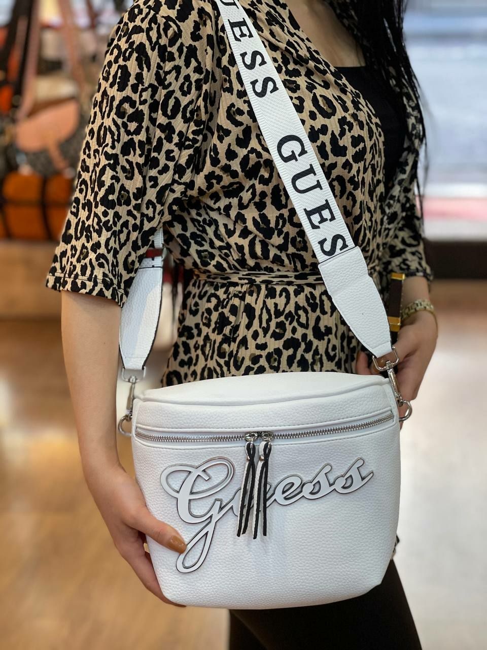 Τσάντα γυναικεία Guess, πολύ μοντέρνα σε χρώμα λευκή, μεταλλικό λευκό λογότυπο GUESS. Κατασκευασμένη από υψηλής ποιότητας οικολογικό δέρμα. Συνοδεύεται από καταπληκτικό φαρδύ ασπρόμαυρο ιμάντα Guess.