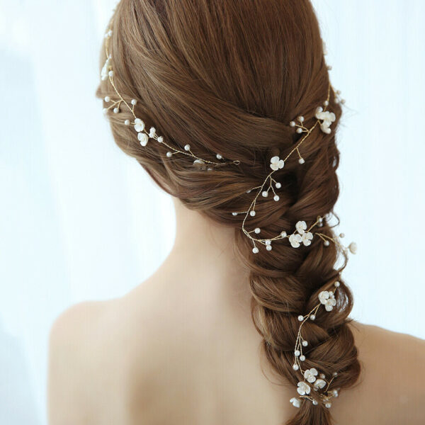 Νυφικό κόσμημα, για την ομορφότερη στιγμή της ζωή σας, το γάμου σας. Nυφική κορδέλα 100 εκατοστών κατασκευασμένη από εύκαμπτο ατσάλι, διακοσμημένη με λευκά λουλούδια και λευκές πέρλες. Mε επιμετάλλωση κίτρινου χρυσού. Τιμή 57 ευρώ. Κωδικός WG50
