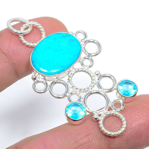 Χειροποίητo ινδικό μενταγιόν. Κατασκευασμένο από ασήμι 925. Διακοσμημένο στο κέντρο με 100% φυσική, ορυκτή, ακατέργαστη πέτρα Turquoise σε κοπή oval και δύο πέτρες μπλε τοπάζ (lab creation) σε κοπή round.