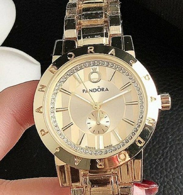 Γυναικείο ρολόι πολυτελείας PANDORA, αναλογικό, πολύ μοντέρνο, σε gold χρώμα σε μπρασελέ και καντράν υψηλής αντοχής και ποιότητας για καθημερινή χρήση και με ενισχυμένο ορυκτό τζάμι στο καντράν του! Διακοσμημένο εσωτερικά με λευκά αυστραλιανά κρύσταλλα σε κοπή round! Κατασκευασμένο εξ ολοκλήρου από ανοξείδωτο ατσάλι.