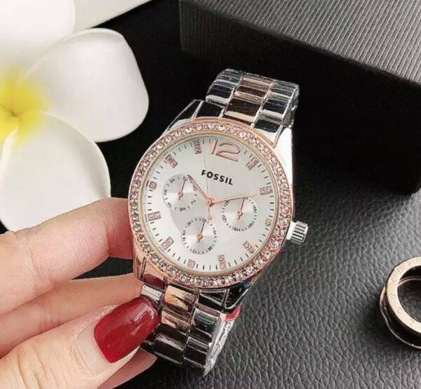 Υπέροχο και μοναδικό αναλογικό ρολόι πολυτελείας FOSSIL , σε silver & rose gold χρώμα στο μπρασελέ και λευκό χρώμα στο καντράν . Η κάσα του λιτά διακοσμείται περιμετρικά με λευκά ζιργκόν εξαιρετικής καθαρότητας και ποιότητας σε κοπή round! Διάσταση καντράν 38.7 mm! Το ρολόι είναι κατασκευασμένο από ανοξείδωτο ατσάλι!