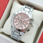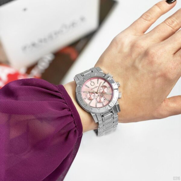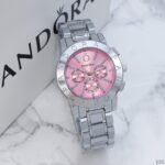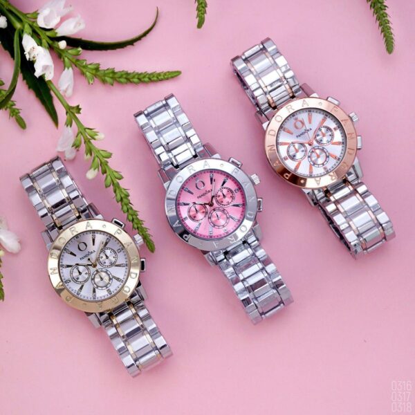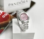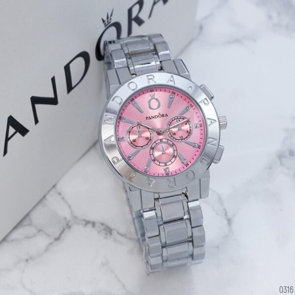 Γυναικείο ρολόι πολυτελείας Pandora, αναλογικό, πολύ μοντέρνο, σε silver χρώμα στο μπρασελέ και ροζ χρώμα μέσα στο καντράν με αυστραλιανά κρύσταλλα εξαιρετικής ποιότητας στο εσωτερικό του καντράν. Υψηλής αντοχής και ποιότητας για καθημερινή χρήση! Το κρύσταλλο του είναι από ορυκτό γυαλί που καλύπτεται από συνθετικό ζαφείρι (Sapphlex)!