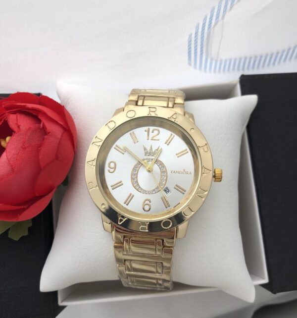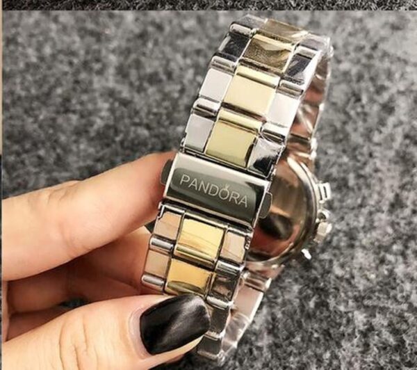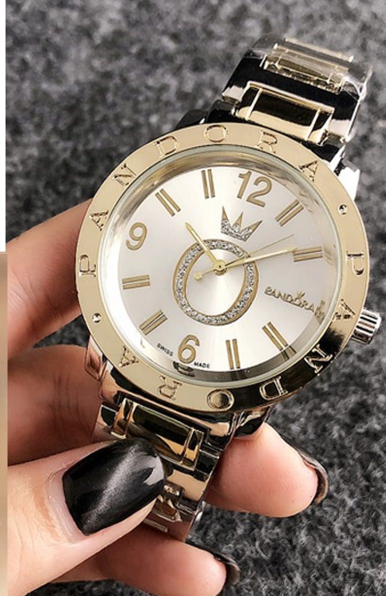 Γυναικείο ρολόι PANDORA πολυτελείας με Silver-gold μπρασελέ και καντράν! Κατασκευασμένο εξ ολοκλήρου από ανοξείδωτο ατσάλι, είναι αδιάβροχο μέχρι 3 Atm (πλύσιμο χεριών).  Διάμετρος καντράν 4,2 εκατοστά με ορυκτό κρύσταλλο!! Διακοσμημένο στο εσωτερικό του με λευκά ζιρκόνια σε κοπή round!!