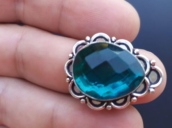 Χειροποίητο δαχτυλίδι, κατασκευασμένο από ασήμι 925 και διακοσμημένο με έναν γαλαζοπράσινο Τσαβορίτη χαλαζία (Lab-Created) εκτυφλωτικής λάμψεις σε κοπή pear. Ιδιαίτερο το καστόνι του δαχτυλιδιού! Διαστάσεις πέτρας 3,2 Χ 2 εκατοστά.