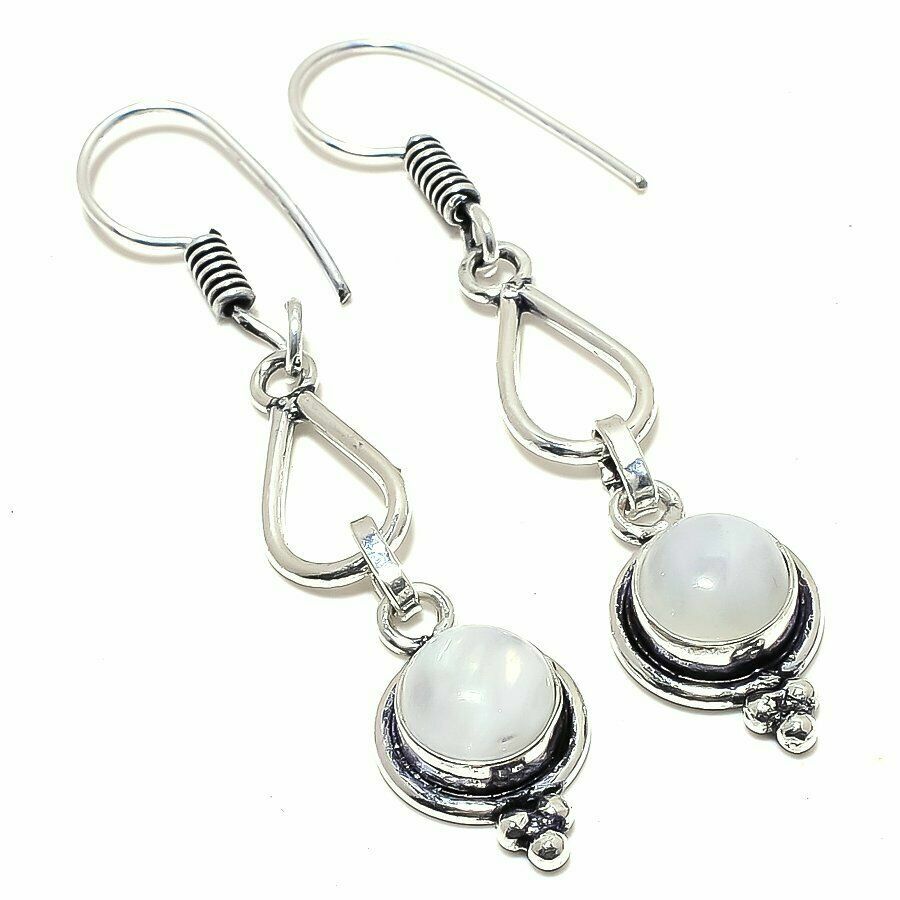 Χειροποίητα σκουλαρίκια κατασκευασμένα από ασήμι 925, διακοσμημένο με moonstone (Φεγγαροπετρα) ορυκτή πολύτιμη πέτρα σε κοπή round! Το μήκος είναι 5,3 εκατοστά.