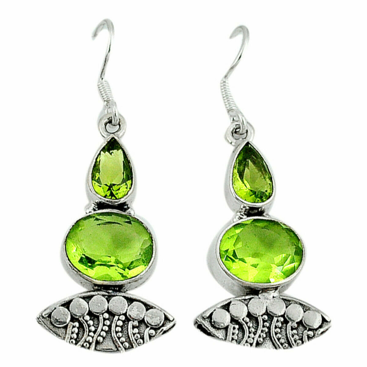 Κρεμαστά, χειροποίητα σκουλαρίκια κατασκευασμένα από μασίφ ασήμι 925 με vintage αισθητική! Διακοσμημένα με πολύτιμα ορυκτά (peridot) Περιδοτίτης σε κοπή pear και round. Τα σκουλαρίκια έχουν μήκος 3,9 εκατοστά.