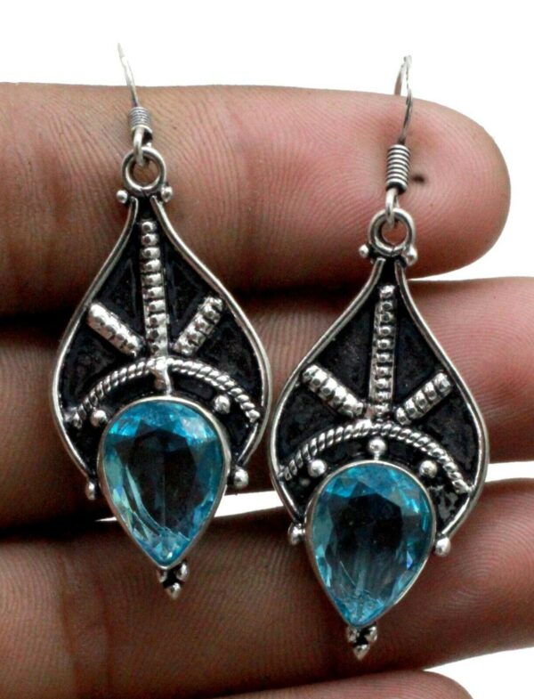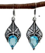 Χειροποίητα σκουλαρίκια, κατασκευασμένα από ασήμι 925 και διακοσμημένα με Swiss Blue Topaz σε κοπή heart. Total Carat Weight (TCW): 35. Τα σκουλαρίκια έχουν μήκος 5 εκατοστά..