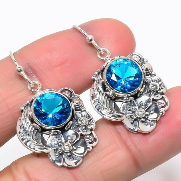 Χειροποίητα ινδικά σκουλαρίκια, κατασκευασμένα από ασήμι 925. Διακοσμημένα με πέτρα Blue Topaz (lab creation) σε κοπή round και περιμετρικά πέτρες λευκού τοπάζ σε κοπή round