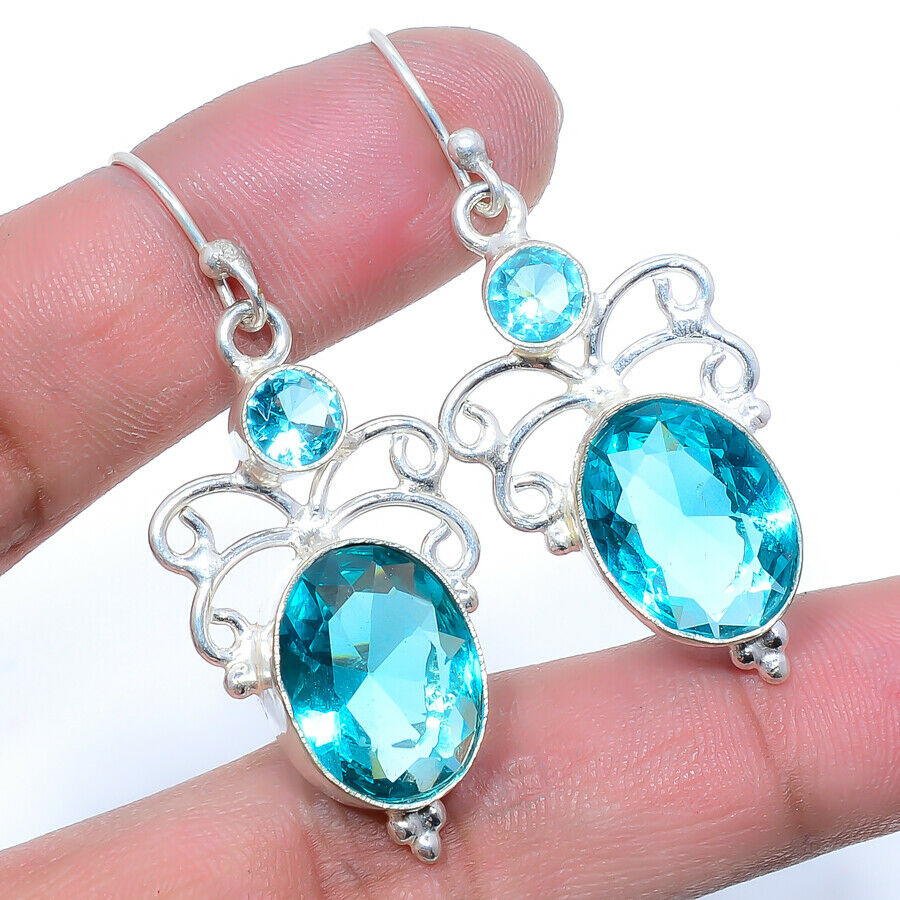 Χειροποίητα ινδικά σκουλαρίκια, κατασκευασμένα από ασήμι 925. Διακοσμημένα με Ελβετικό μπλε τοπάζι (Swiss Blue Topaz) (lab creation) σε κοπή oval και round.