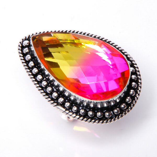 Χειροποίητο ινδικό δαχτυλίδι, κατασκευασμένο από ασήμι 925. Διακοσμημένο με πέτρα πολύχρωμης Τουρμαλίνης (Multi Color Tourmaline) (lab creation) σε κοπή pear. Ένα Open Size δαχτυλίδι!