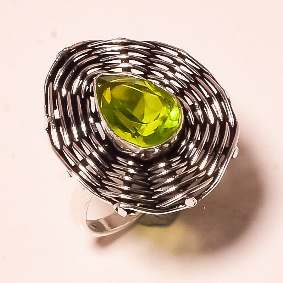 Χειροποίητο ινδικό δαχτυλίδι, κατασκευασμένο από ασήμι 925, διακοσμημένο με ορυκτή, πολύτιμη πέτρα Περιδοτίτη (peridot), εξαιρετικής καθαρότητας και λάμψης, σε κοπή pear. Total Carat Weight (TCW): 25
