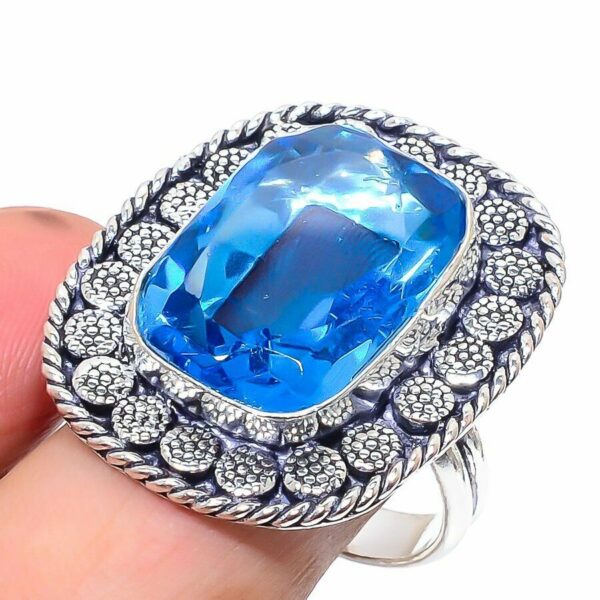 Xειροποίητο ινδικό δαχτυλίδι κατασκευασμένο από ασήμι 925 και διακοσμημένο με ένα 100% φυσικό ορυκτό, πολύτιμο, λαμπερό μπλε τοπάζι (Swiss Blue Topaz) σε κοπή emerald. Το δαχτυλίδι διατίθεται σε νούμερο 10 ή 62.