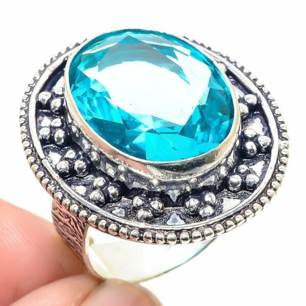 Ινδικό, χειροποίητο, δαχτυλίδι κατασκευασμένο από ασήμι 925 και διακοσμημένο με ένα λαμπερό σουηδικό μπλε τοπάζι (Lab creation) σε κοπή οβάλ. Περιστοιχίζεται από ροζέτα εξαιρετικής σχεδίασης. Το δαχτυλίδι είναι διαθέσιμο στο νούμερο 19 ή 59 & 20 ή 62.