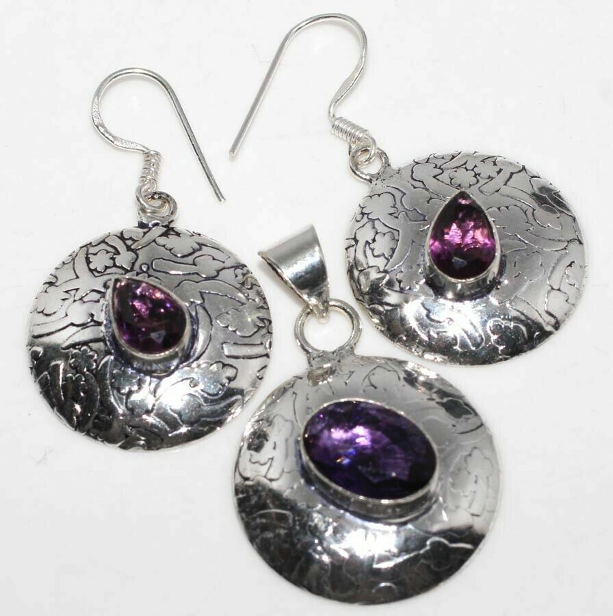 Χειροποίητο σετ που αποτελείται από μενταγιόν μαζί με την αλυσίδα του και σκουλαρίκια. Κατασκευασμένο από ασήμι 925 διακοσμημένο με λαμπερές υπέροχες πέτρες αμέθυστου σε κοπή Pear & oval. Τα σκουλαρίκια έχουν μήκος 4,3 εκατοστά και το μενταγιόν 4,5 εκατοστά.