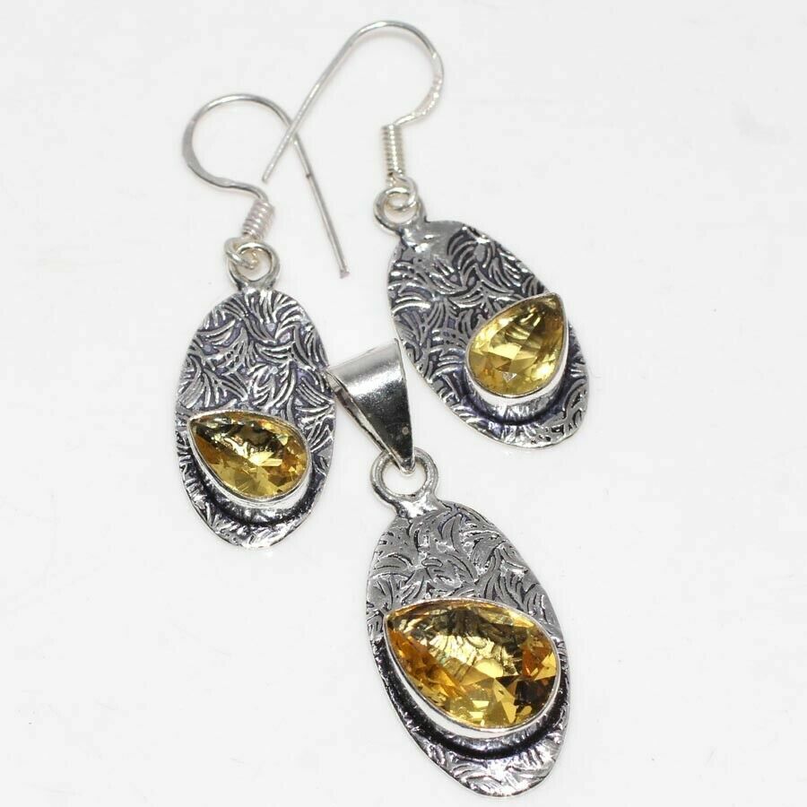 Χειροποίητο σετ που αποτελείται από μενταγιόν μαζί με την αλυσίδα του και σκουλαρίκια. Κατασκευασμένο από ασήμι και χαλκό διακοσμημένο με λαμπερές υπέροχες πέτρες Citrine σε κοπή Pear. Τα σκουλαρίκια έχουν μήκος 3,8 εκατοστά και το μενταγιόν 4 εκατοστά.