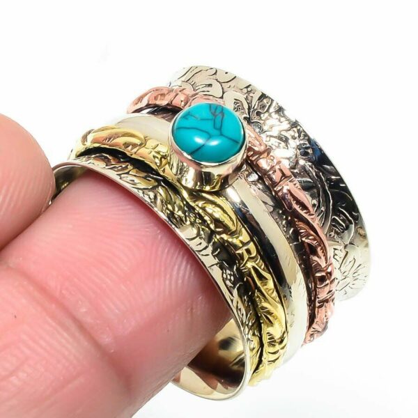 Δαχτυλίδι Spinner Rings, χειροποίητο, κατασκευασμένο από ασήμι 925 και διακοσμημένο με φυσικό, ορυκτό, ημιπολύτιμο λίθο τυρκουάζ. Διαθέτει επιμετάλλωση στα τρία χρώματα του χρυσού, κίτρινου ροζ και λευκού.