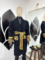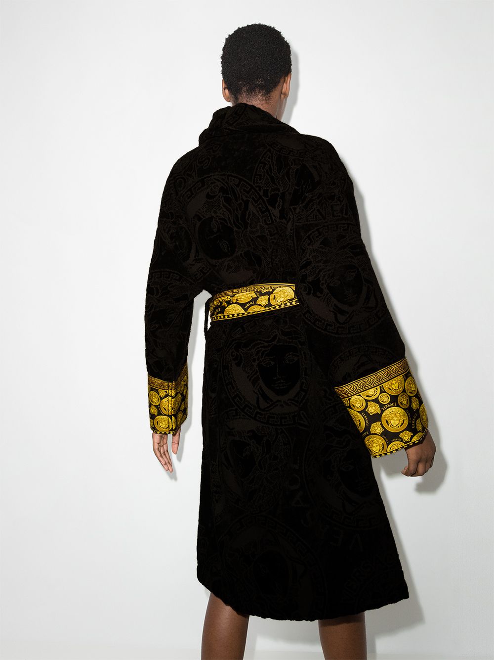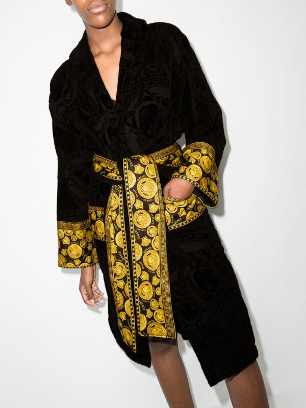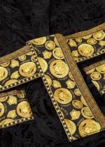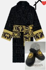 ΣΕΤ Versace μαύρο μπουρνούζι με παντόφλες. Δώστε στο μπάνιο σας μία αίσθηση πολυτελείας!! Καταπληκτικό μπουρνούζι με βελούδινη αίσθηση. Κατασκευασμένο από 100% βαμβάκι. κεντημένο με χρυσή κλωστή. Διαθέσιμο σε όλα τα νούμερα. Eρχεται σε σας σε κουτί Versace.
