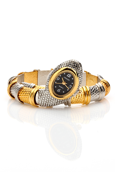 Εξαιρετικό γυναικείο ρολόι snake style fashion που αγκαλιάζει τον καρπό και ταιριάζει σε όλους τους γυναικείους καρπούς. Αναλογικό με μαύρο καντράν ενώ το μπρασελέ του είναι δίχρωμο σε silver και gold απόχρωση.