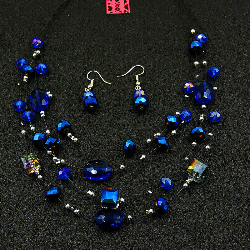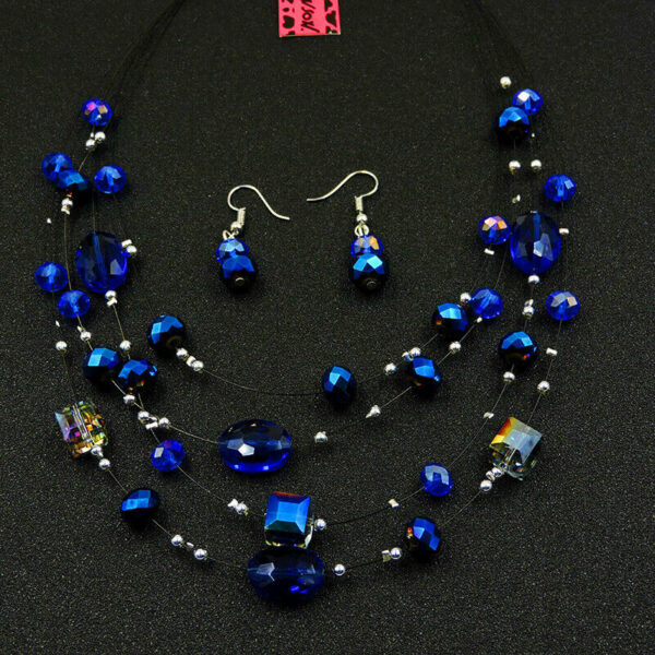 Στο χρώμα του μπλε σετ που αποτελείται από κολιέ 4 σειρών και σκουλαρίκια, κατασκευασμένο από σμάλτο με επιμετάλλωση από ασήμι και διακοσμημένο με κρύσταλλα κομμένα πολύπλευρα έτσι ώστε να αντανακλούν το φως φιλοτεχνημένο από την Βetsey Johnson
